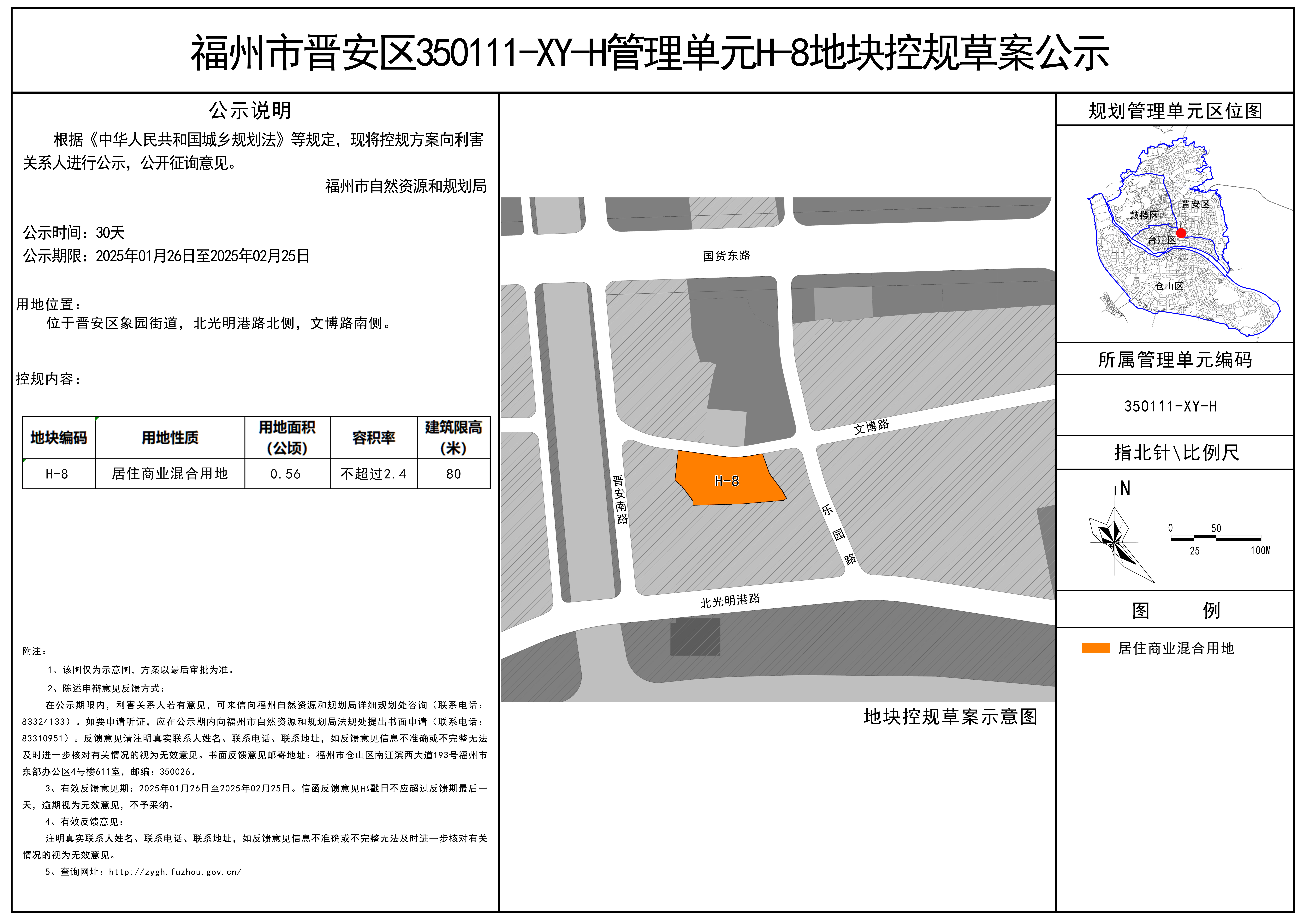 福州市晋安区350111-XY-H管理单元H-8地块位于晋安区文博路以南,乐园路以西。该控规草案经研究审议,根据《中华人民共和国城乡规划法》 等相关规定,现征求利害关系人意见,公示时间 2025年 1月26日 至 2025年 2月 25日 , 详 情 可 查 阅 网 站 (//97ent.com)。