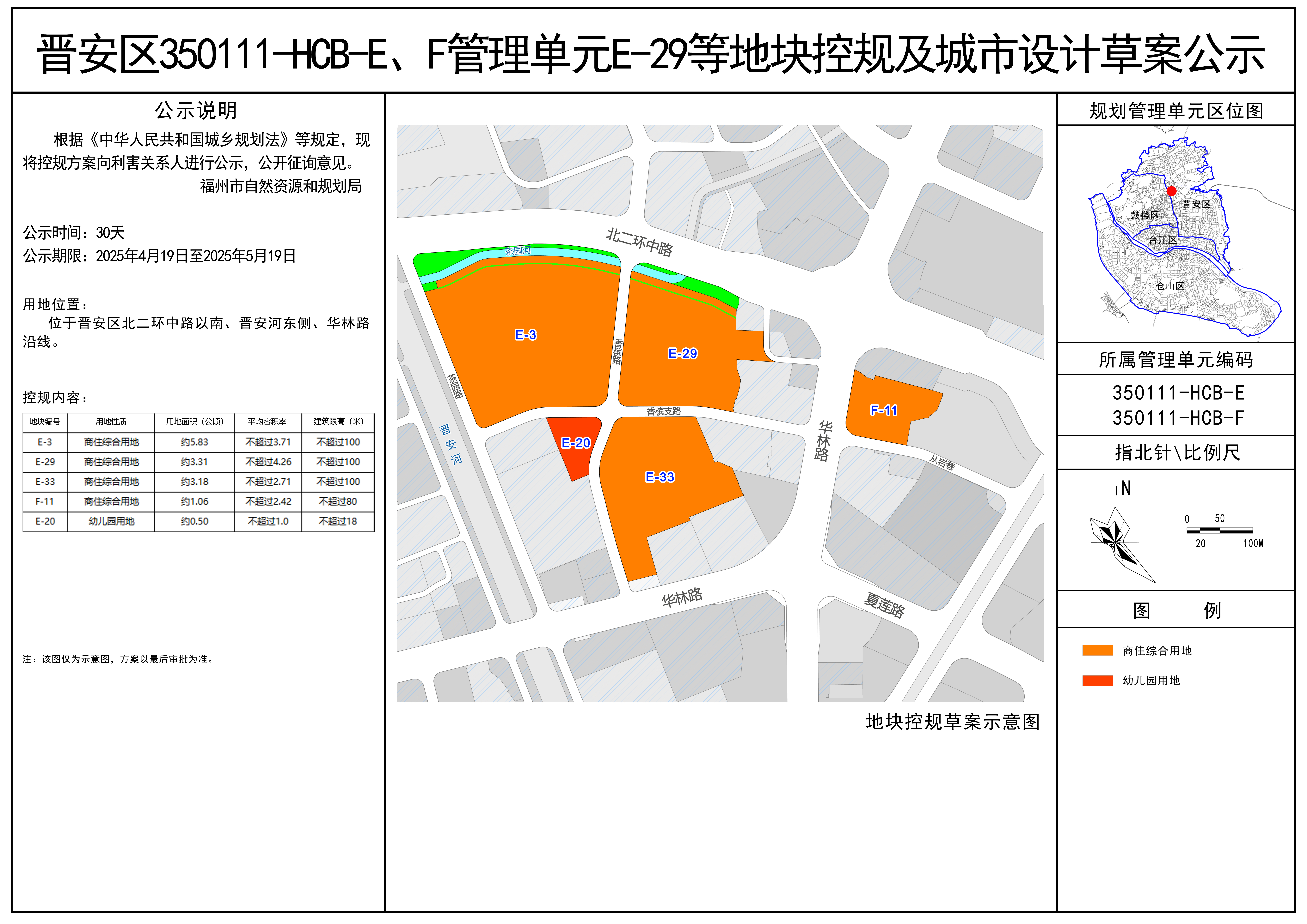 晋安区350111-HCB-E、F管理单元E-29等地块位于晋安区北二环中路以南、晋安河东侧、华林路沿线。该控规及城市设计草案经研究审议,根据《中华人民共和国城乡规划法》等相关规定,现广泛征求社会各界意见,公示时间2025年4月19日至2025年5月19日,详情可查阅网站(//97ent.com)。