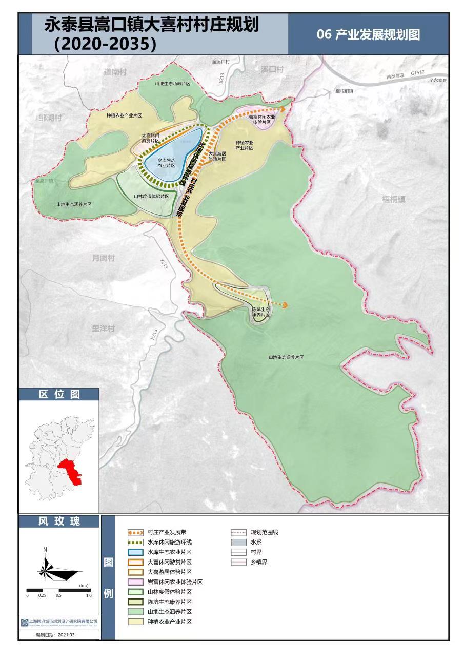 大喜村是第一批“国家森林村庄”、全国人居环境整治示范村、国家 AA 级旅游景区、福建省最美休闲乡村、福建省旅游精品村、福州市乡村旅游精品示范点。现状以种植油茶、李果为主,大喜村村庄规划提出“特色化、高质化、品牌化、生态化”发展思路,发展乡村特色文化产业,促进乡村产业振兴。