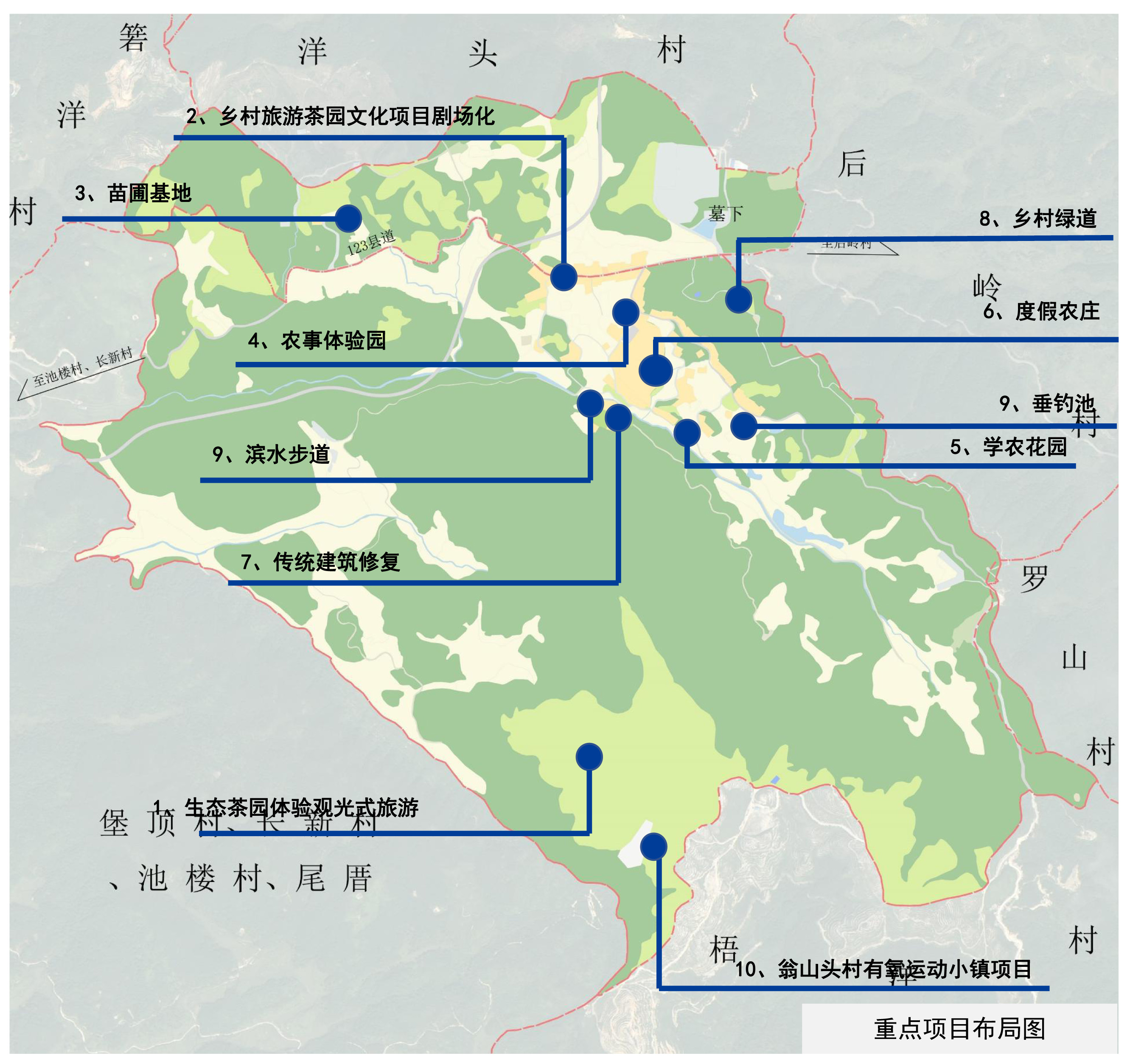 翁山头村位于闽清县下祝乡,海拔相对较高,夏季气候凉爽,生态环境优良,农产资源丰富,具备良好的避暑度假条件。结合下祝乡的乡镇定位,即“都市避暑度假、城市户外旅居基地”,在翁山头村村庄规划编制中,将翁山头村、后岭村、罗山村统一规划,通过统筹部署规划区内的基础设施及产业配套设施明确各村的核心产业及功能,打造三个体验基地—清凉罗山、慢乡翁山头、慢享后岭。对乡村氛围进行“清凉·慢乡村”的主题营造,打造绿色蔬菜、高山茶叶特色等下祝农产品品牌,同时主推文化休闲-农业体验-农产品购物基地、避暑-养老-亲子旅游、户外运动三条旅游发展路线。构建一个集避暑康养、休闲运动、劳动实践、文化体验等功能于一体的避暑康养体验旅游目的地,为规划区内村庄之间的联动发展提供新的动力,推动村庄产业融合发展。