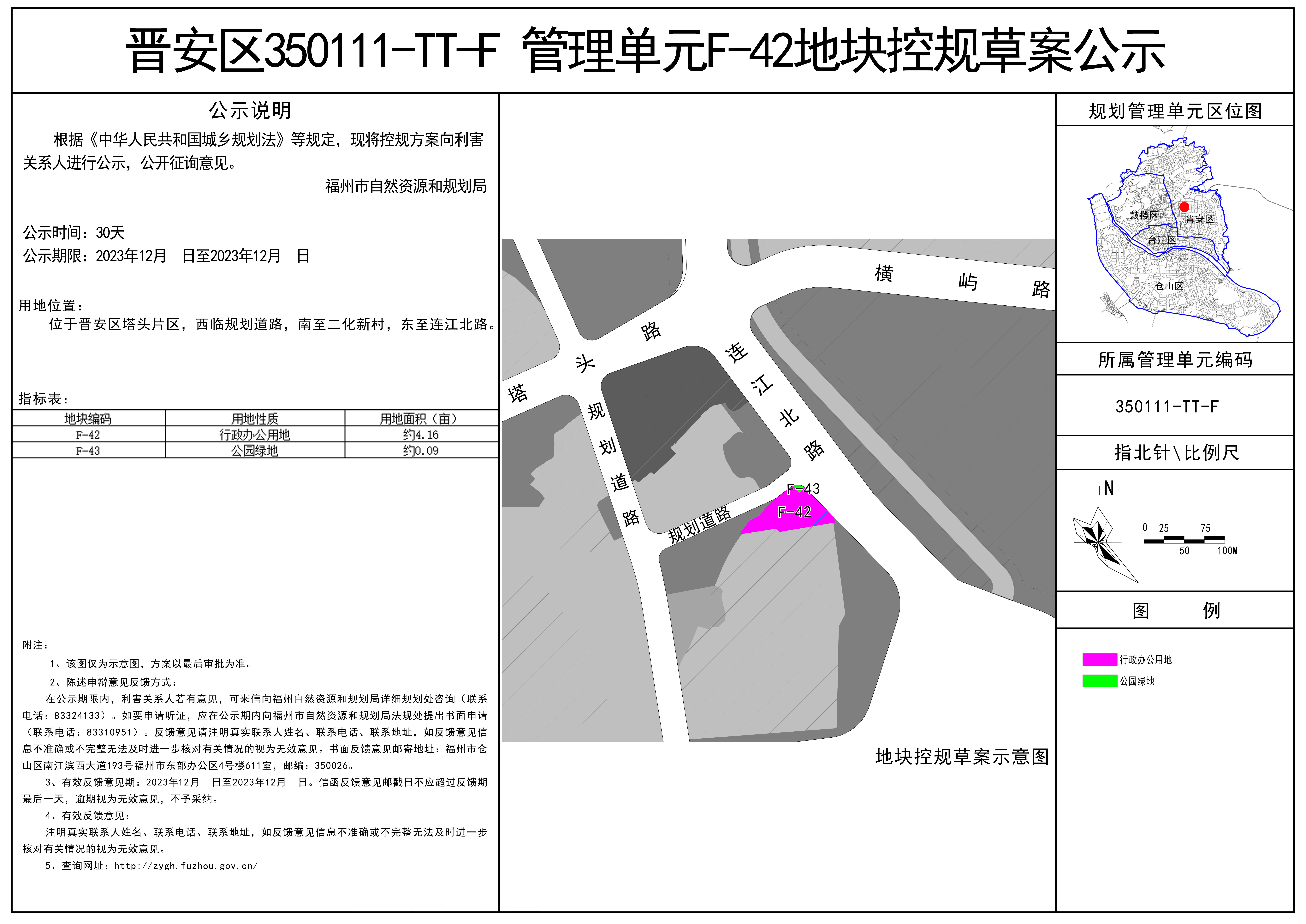 福州市晋安区350111-TT-F管理单元F-42地块控规草案经研究审议,根据《中华人民共和国城乡规划法》等相关规定,现征求利害关系人意见,公示时间2023年12月1日至2023年12月31日,详情可查阅网站(//97ent.com)。